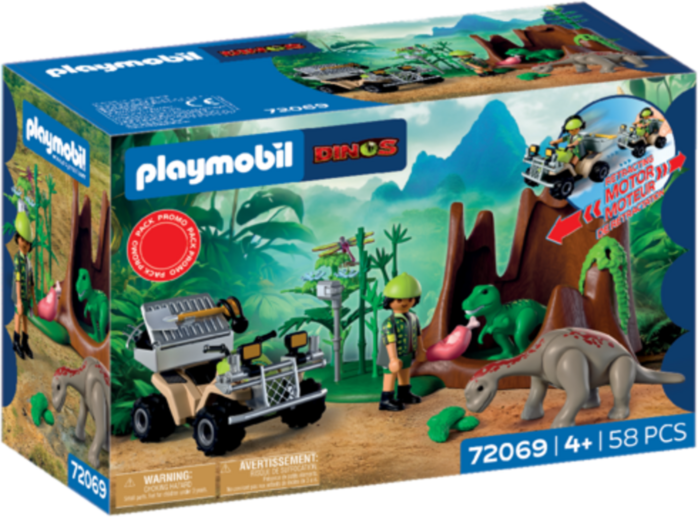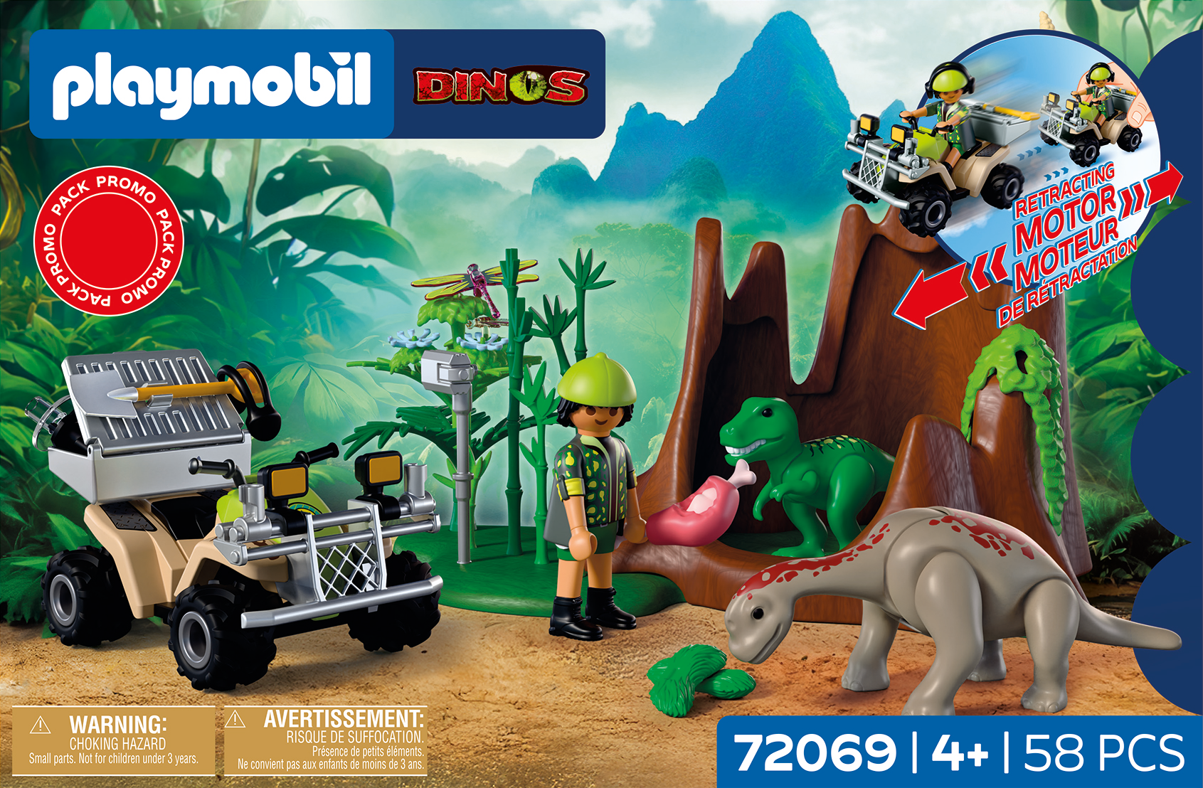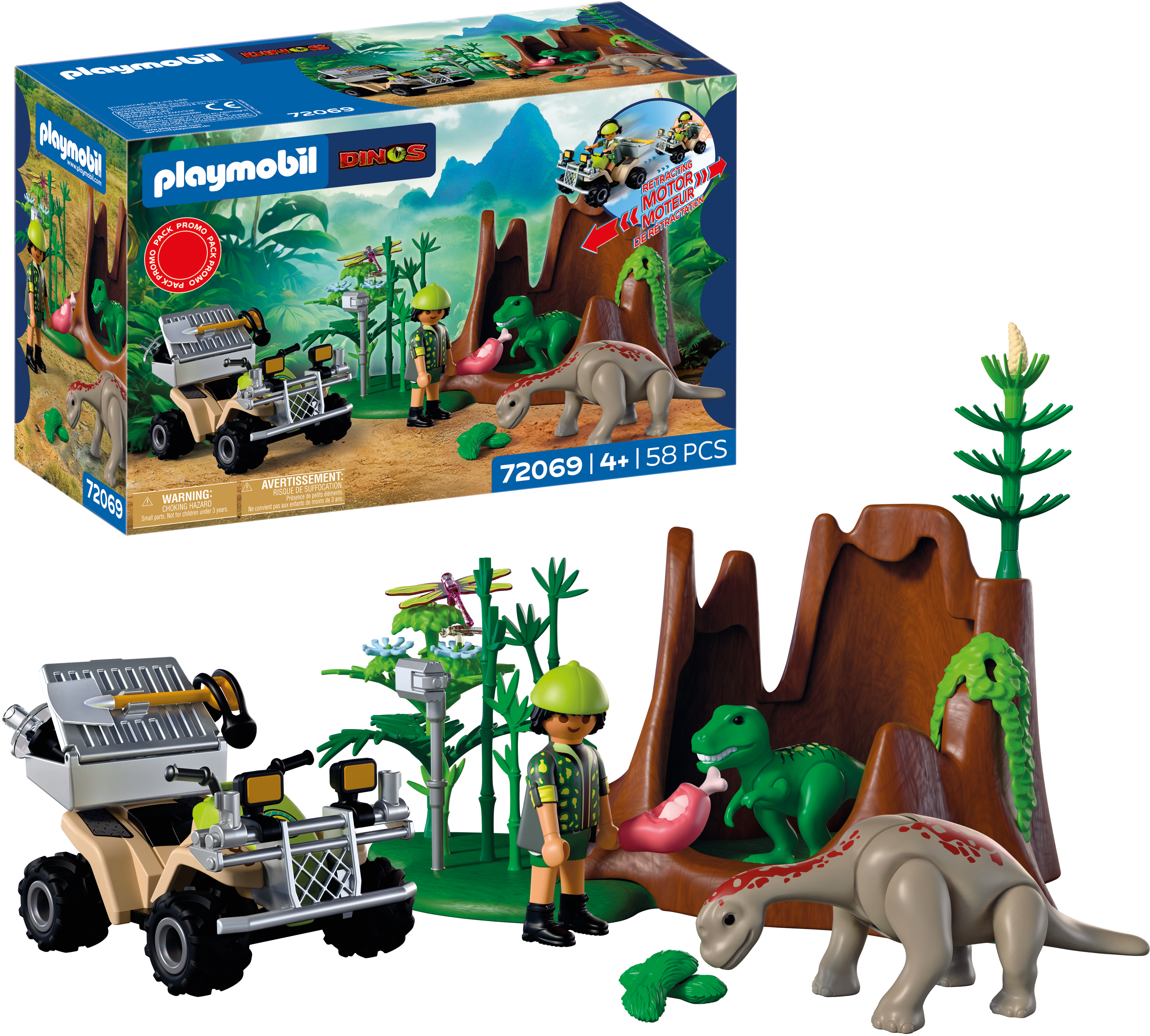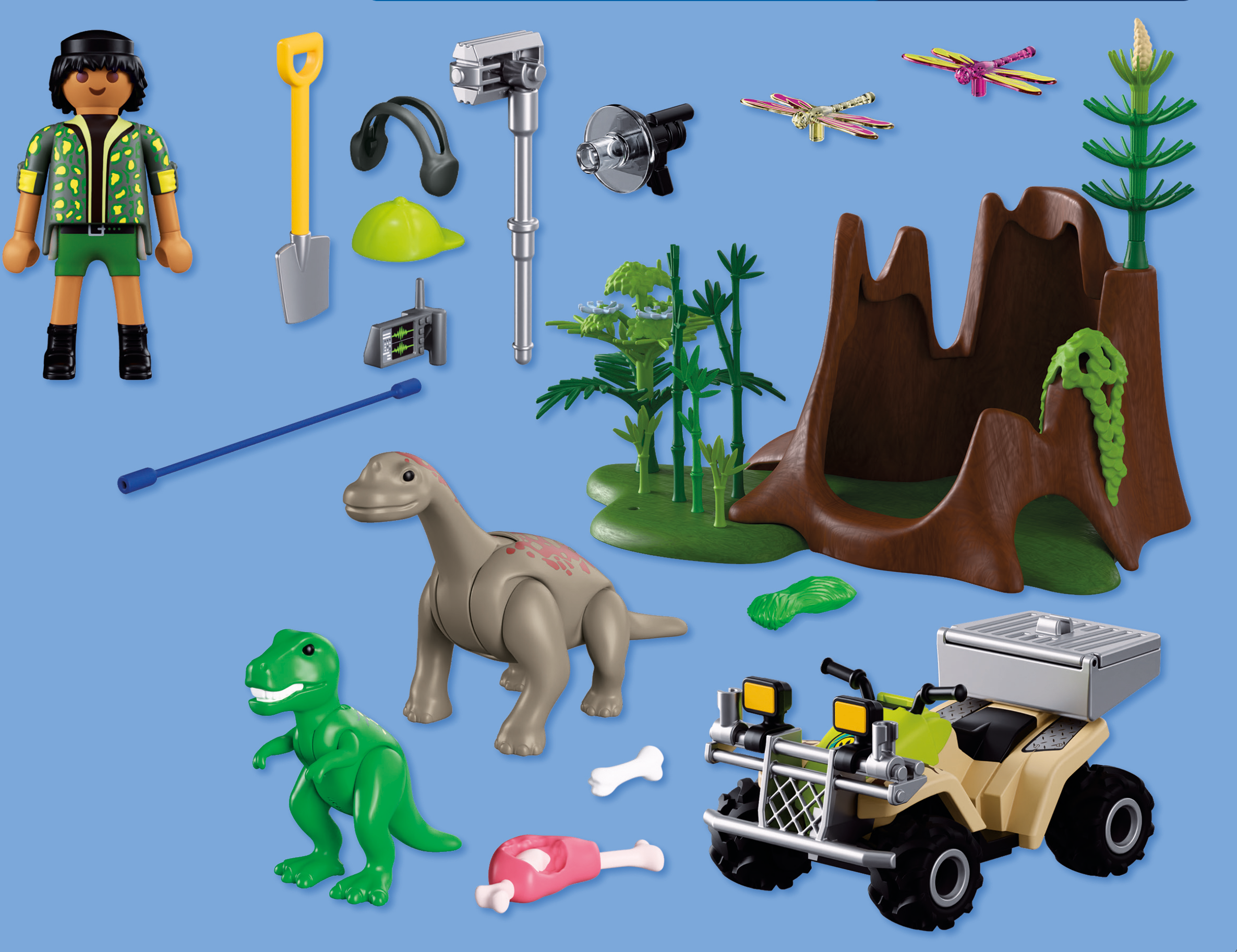 ¡Increíbles descubrimientos aguardan en el escondite de los dinosaurios! El investigador explora el terreno prehistórico con su quad, documenta los sonidos de las crías de dinosaurio y cuida de ellas. Los niños aprenden jugando lo apasionantes que pueden ser la investigación y la naturaleza mientras recrean escenas de forma creativa e inventan sus propias aventuras.