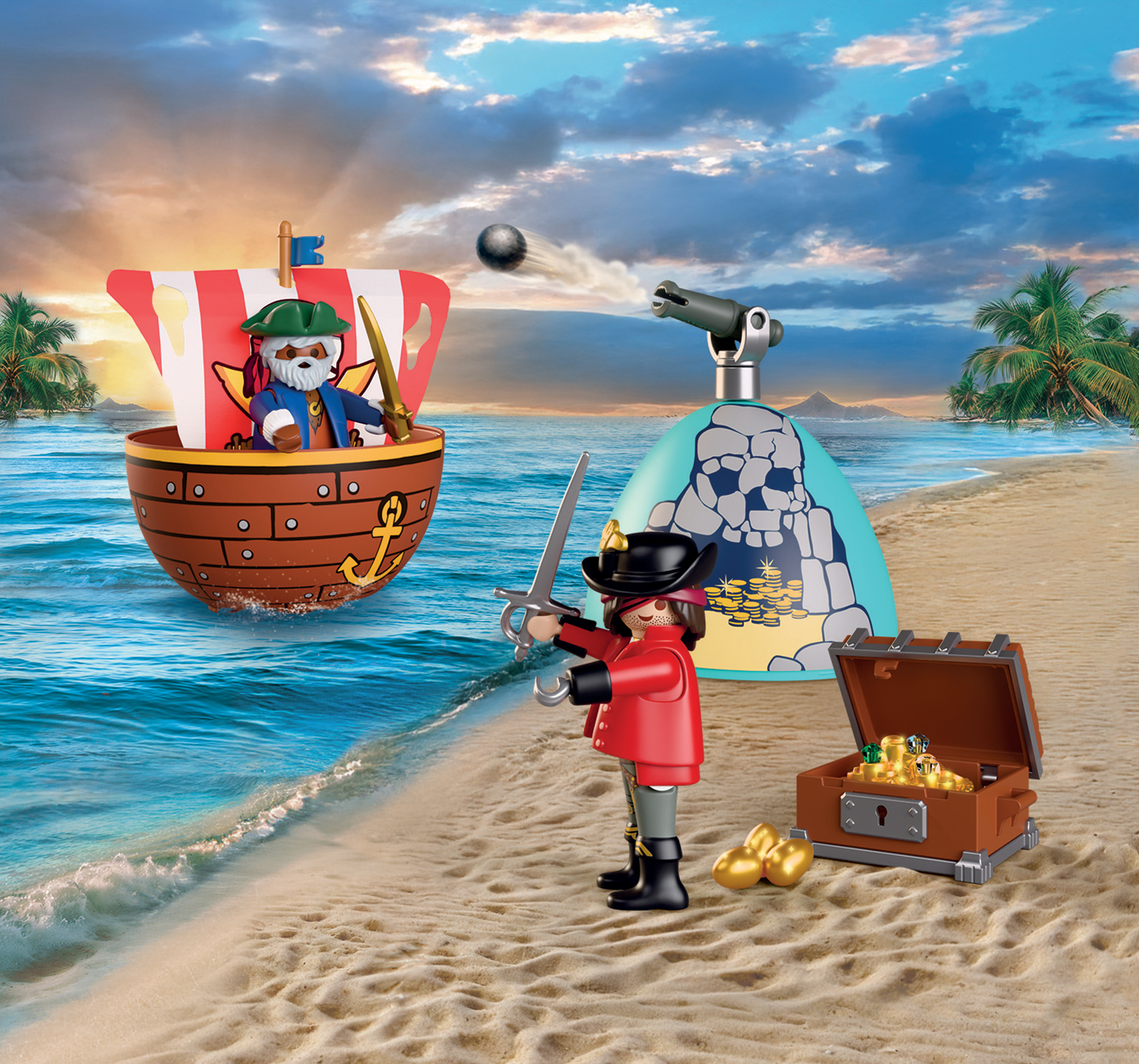 ¡Zarpa hacia la aventura! El Huevopara jugar: Piratas de PLAYMOBIL está lleno de sorpresas y diversión creativa. Dos valientes piratas compiten en un emocionante duelo por un cofre del tesoro lleno de reluciente oro y huevos de Pascua. Sables, espadas, un cañón y piedras preciosas crean escenas llenas de acción que los niños pueden reinventar una y otra vez.