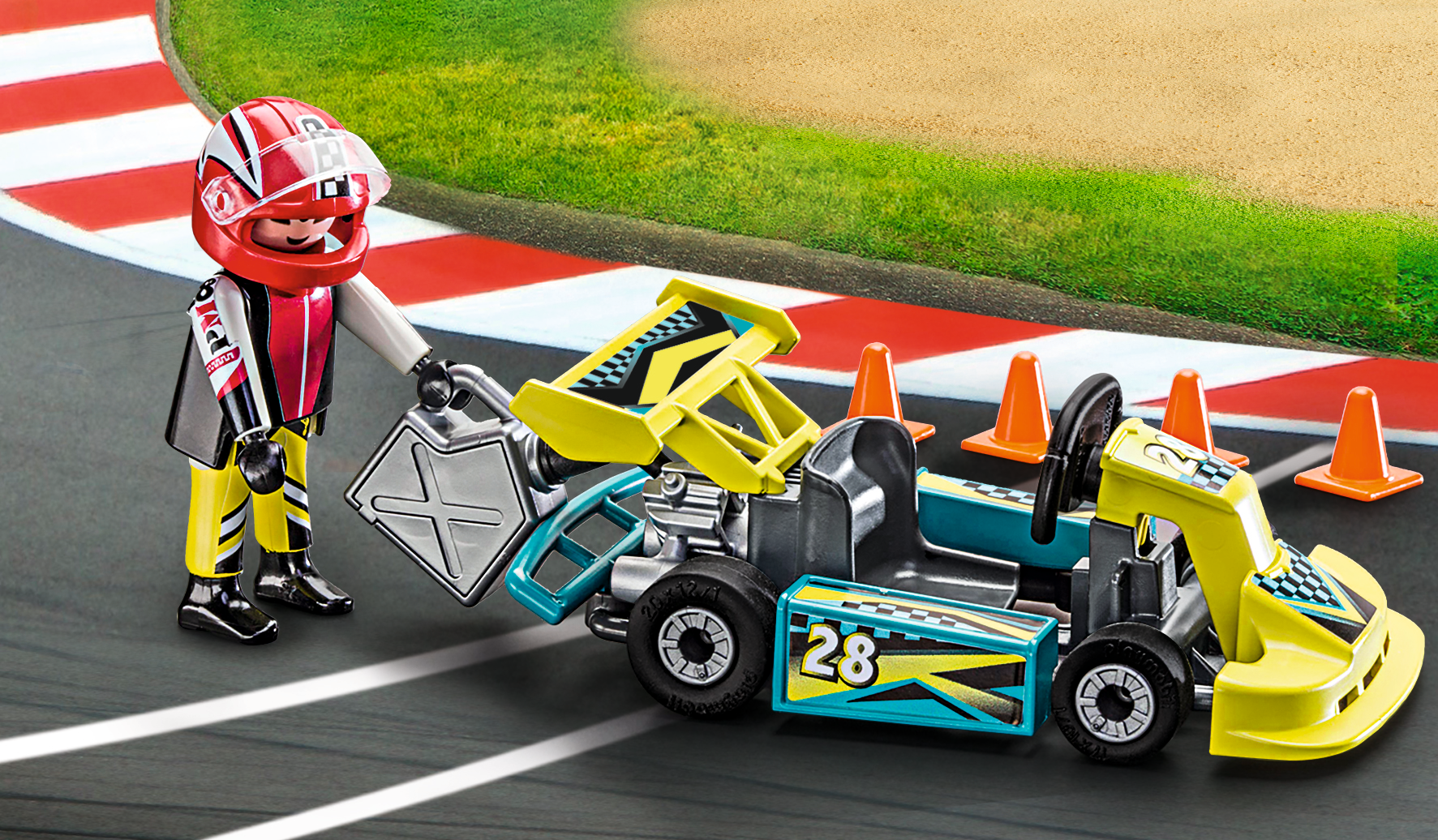 1 piloto de carreras, 1 maleta, 4 pilones, 1 coche de carreras.