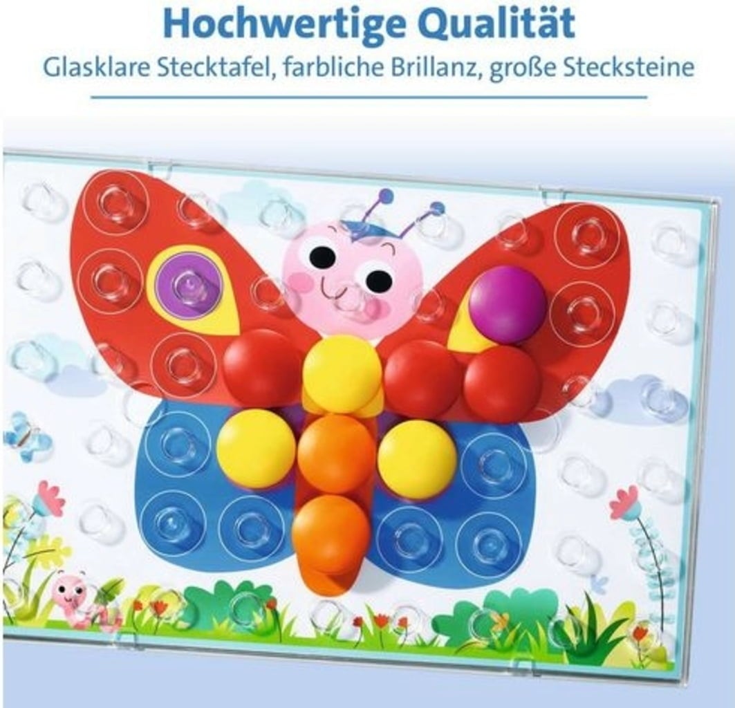 Contenido: 6 tarjetas con diseños impresos por ambas caras (12 diseños), 40 estacas resistentes, 1 tablero transparente, instrucciones.