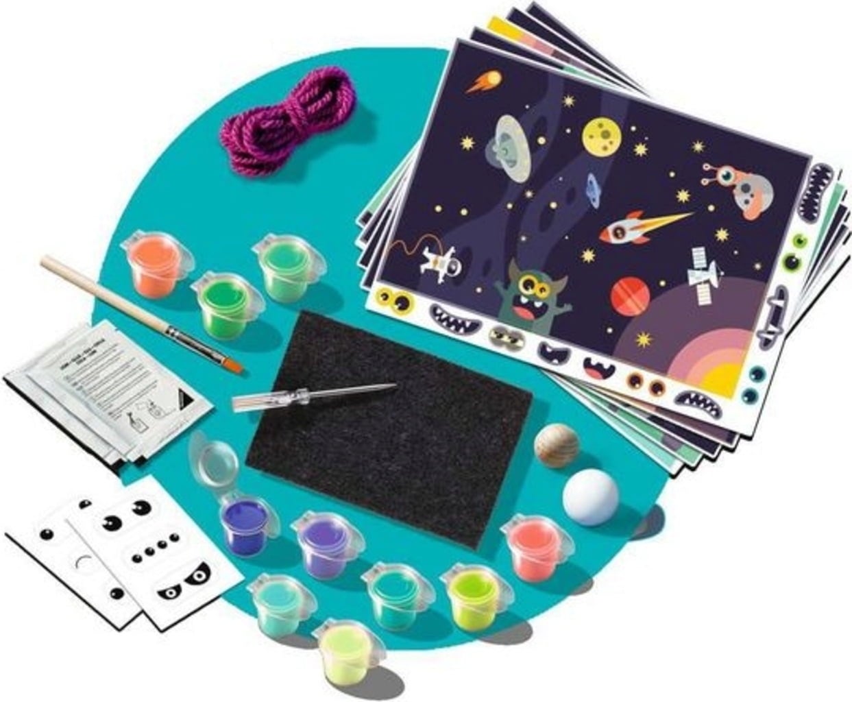 Contenido: instrucciones, hojas recortables, aguja, superficie de perforación, botes de pintura, pincel, lana, bola de madera, bola de plástico, pegamento DIY, hojas de pegatinas.