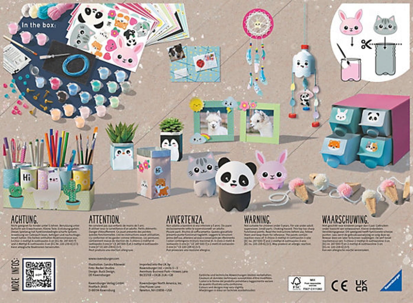 Contenido: Instrucciones, hojas de corte, aguja, tabla perforadora, pincel, clips, goma elástica, pegamento para manualidades, botes de pintura, lana, cuentas.