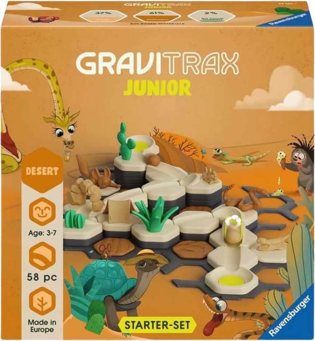¿Te gustaría llevar a tus hijos a un emocionante viaje por la arena del desierto? El set de inicio GraviTrax Junior S Desert ofrece la introducción perfecta y adaptada al mundo de las pistas de canicas. Especialmente diseñado para manos pequeñas a partir de 3 años, este set combina la diversión de la construcción creativa con un mundo desértico con un diseño encantador.