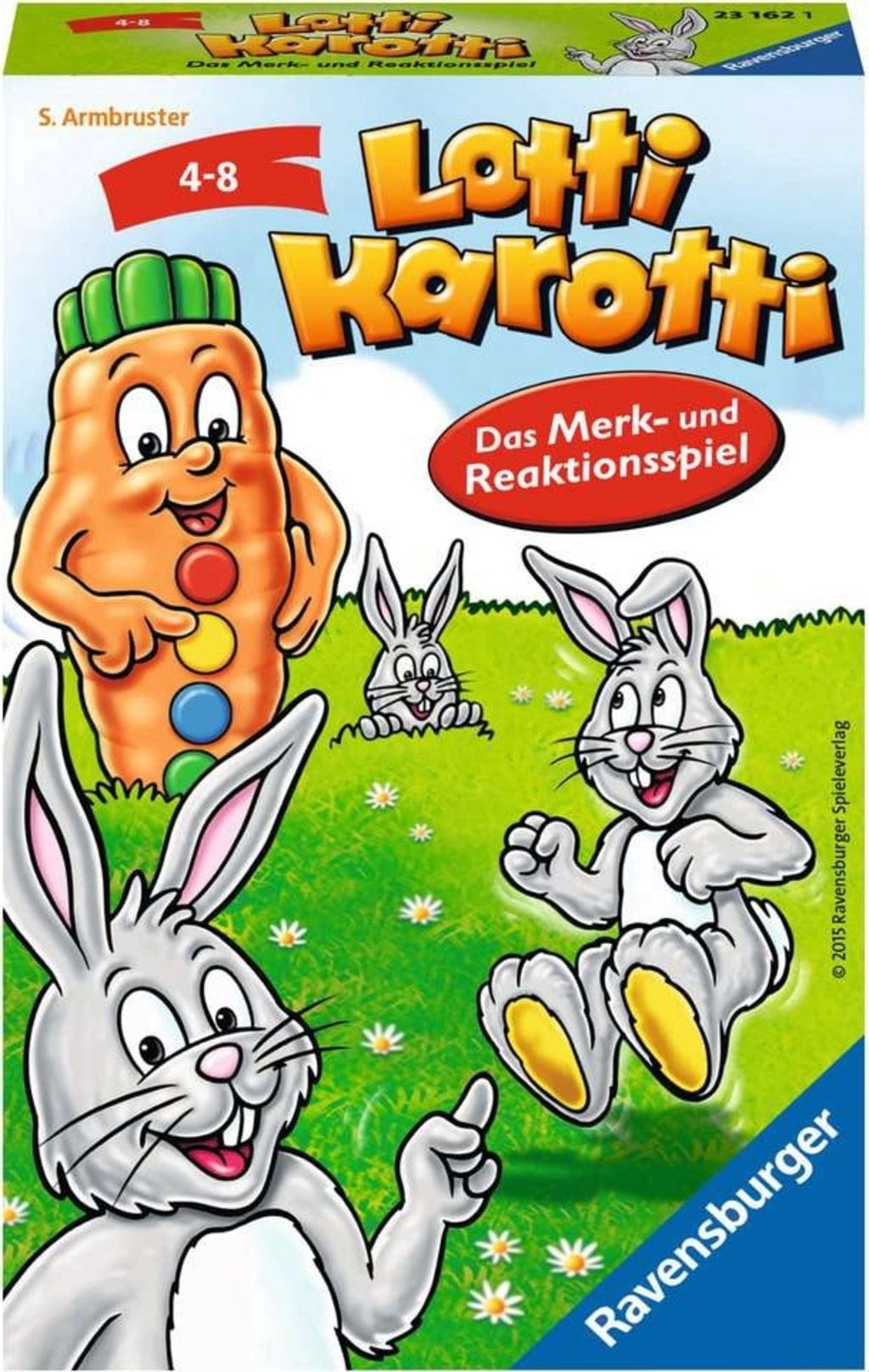¡Todos deben prestar mucha atención a este juego, porque es muy rápido! Se distribuyen tarjetas de zanahoria sobre la mesa y los jugadores, por turnos, dan la vuelta a los conejos para que se vea la parte inferior coloreada. Ahora, todos los jugadores intentan encontrar la tarjeta de zanahoria correspondiente, con los colores en el mismo orden, lo más rápido posible. El primer jugador que consiga tres tarjetas de zanahoria gana.