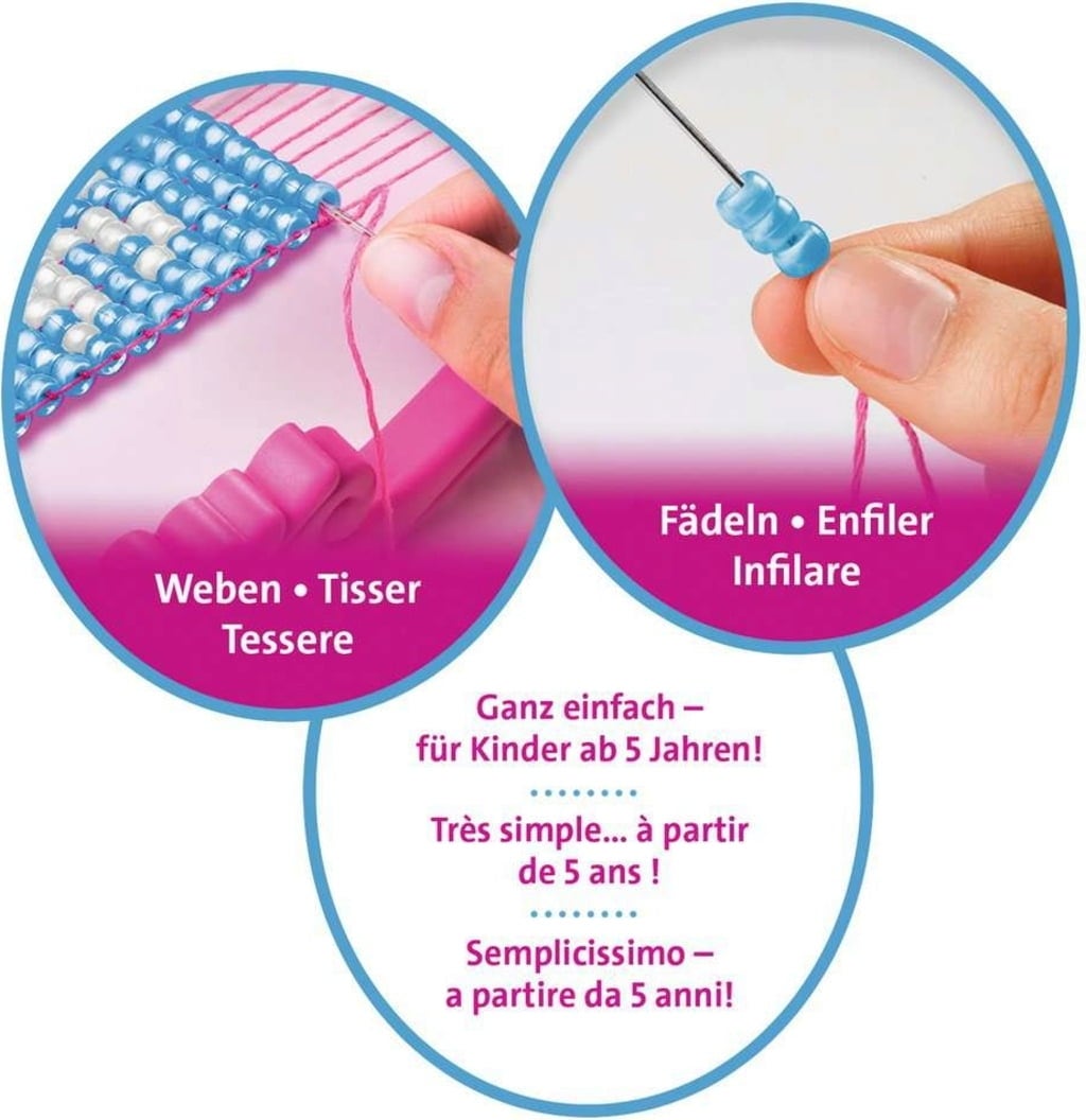 Contenido: instrucciones, 1 telar, 1250 cuentas, 1 amuleto, 10 etiquetas, 3 cuentas de corazón, 16 m de hilo de bordar, 1 aguja.