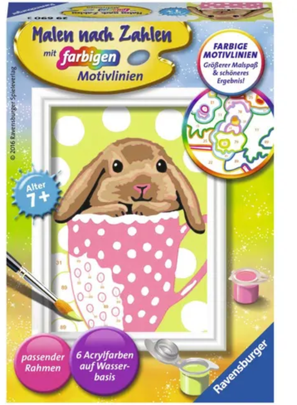 Contenido: paleta de dibujo, 7 colores acrílicos premezclados, pinceles, marco, hoja de plantilla, instrucciones (en alemán).