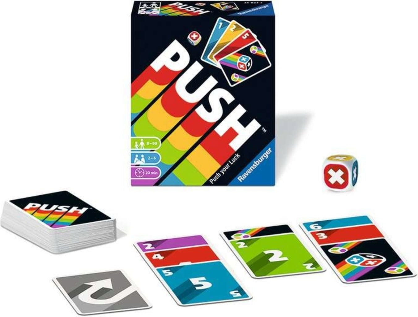 Desafía a tu suerte, ¡pero no te esfuerces demasiado! PUSH es un divertido juego de cartas con reglas sencillas: por turnos, los jugadores roban cualquier número de cartas del montón situado en el centro de la mesa y las colocan en un máximo de 3 filas.