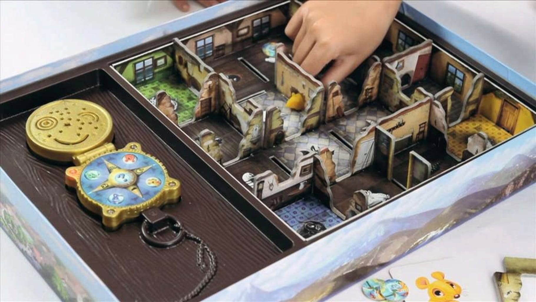 Contenido: 1 brújula mágica, 27 paredes encantadas, 1 tablero de juego tridimensional, 4 fichas de juego, 4 tableros de jugador, 14 fichas.