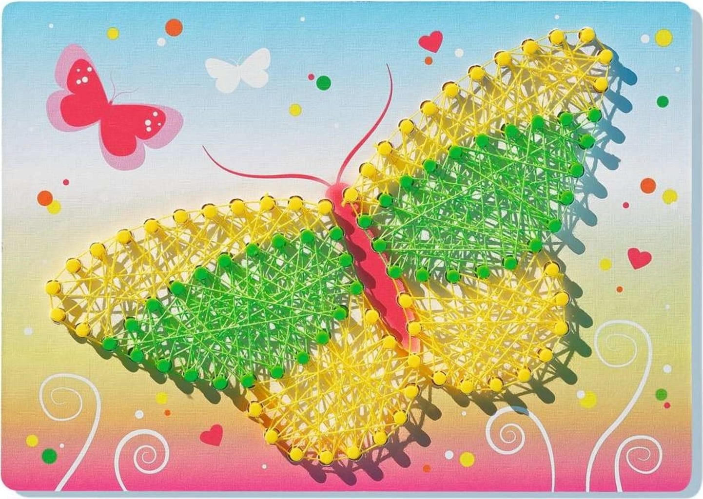 Con unas pocas herramientas, podrás crear fácilmente bellas imágenes de mariposas y flores. Basta con insertar los alfileres de plástico en los orificios correspondientes de las tarjetas de cartón y conectar los hilos de colores de un lado a otro.