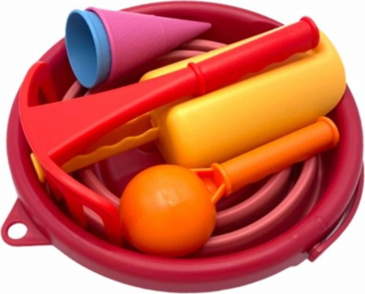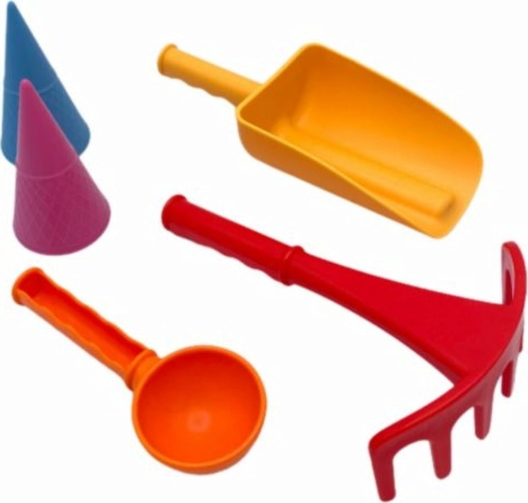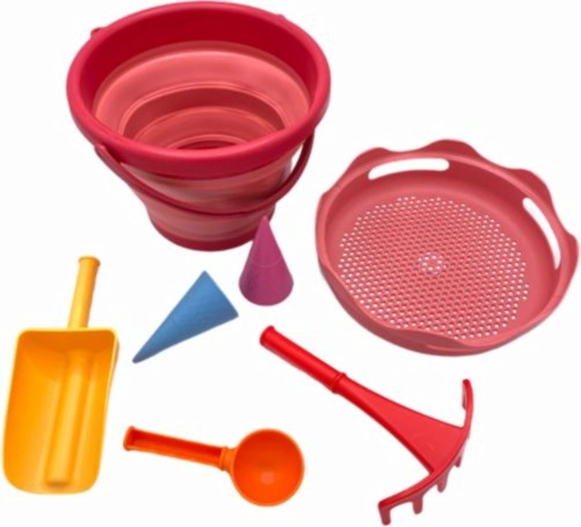 Contenido: cubo plegable, tamiz, rastrillo, pala, cuchara de helado, 2 conos de helado.