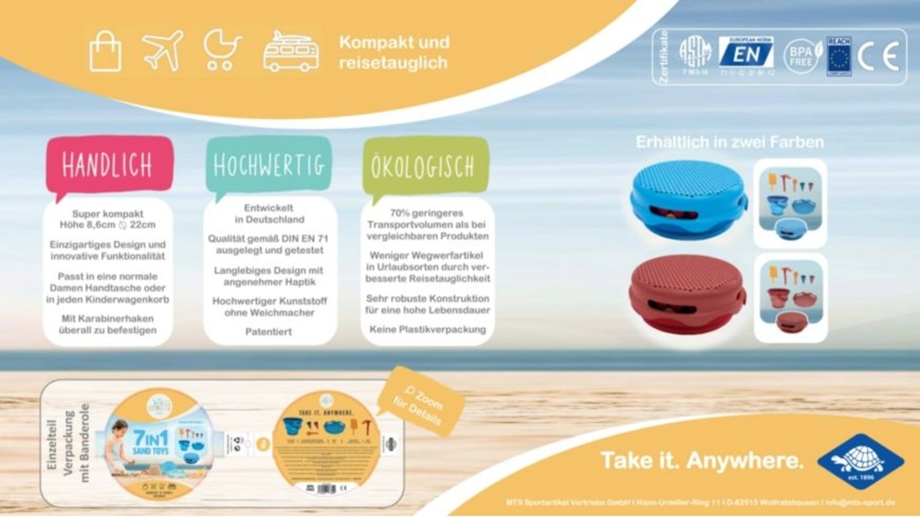 Independientemente de lo lleno que esté el coche, este juego para jugar con arena ahorra espacio y cabe de alguna manera. El cubo plegable funciona en combinación con el colador como una práctica caja de transporte y tiene una altura de 8,6 cm y un diámetro de 22 cm. Los juguetes almacenados de forma segura en su interior animan a cavar, rastrillar y dar forma.