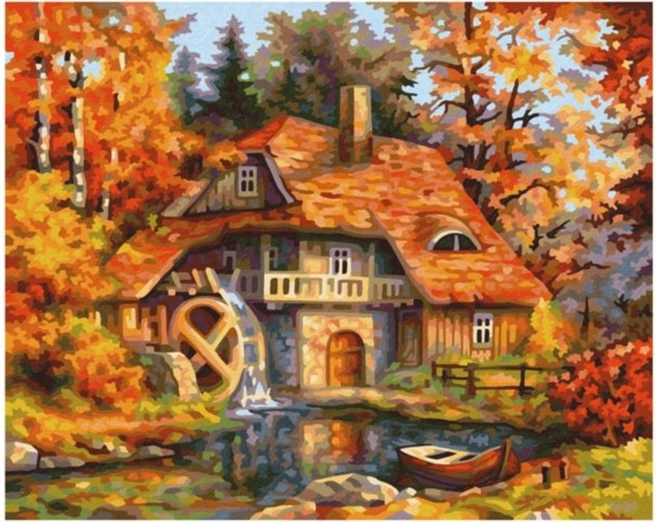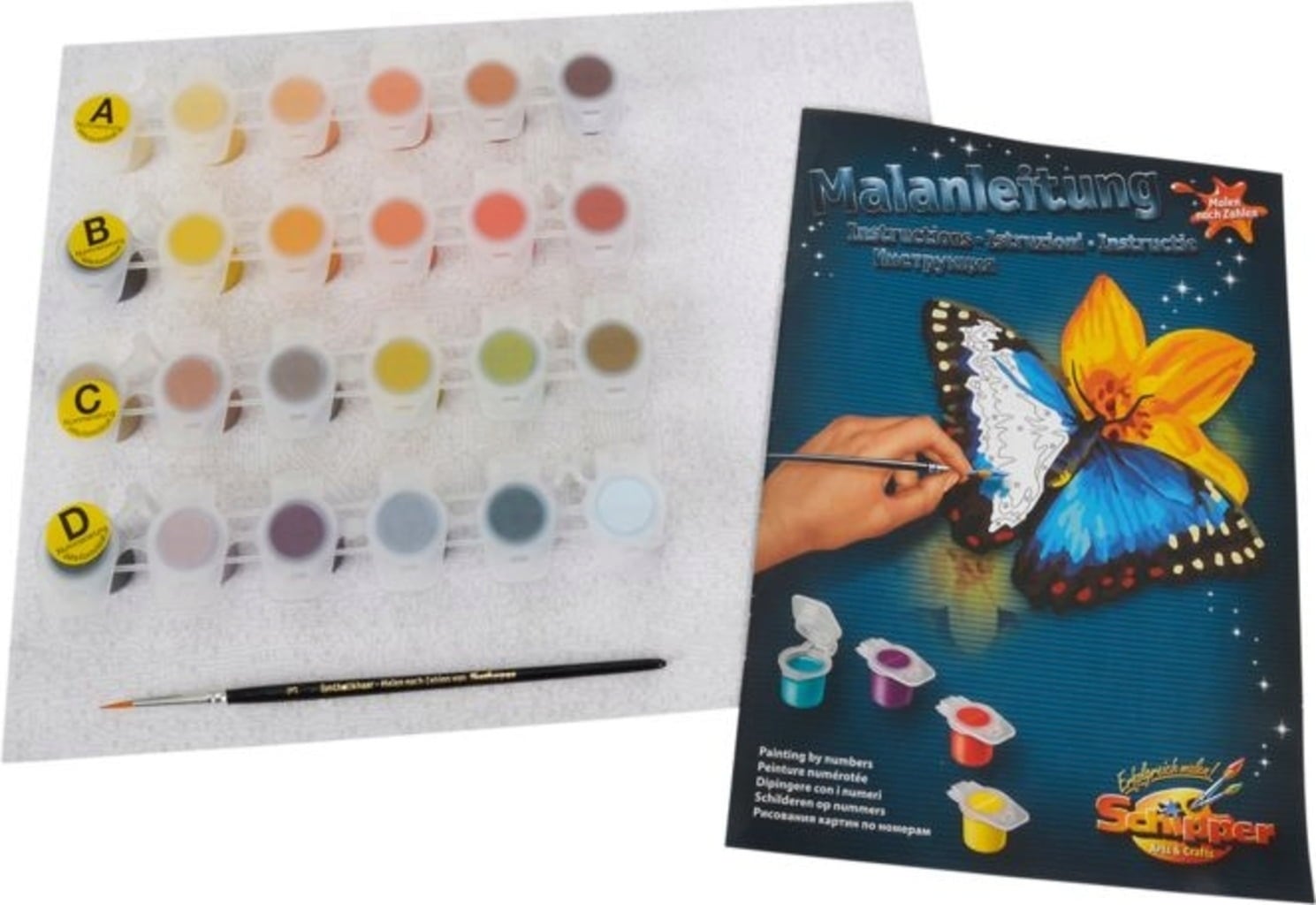 Contenido: Lienzo con estructura de lino y contorno de los dibujos (24 x 30 cm), pinturas acrílicas al agua, pincel, instrucciones, hoja de control.
