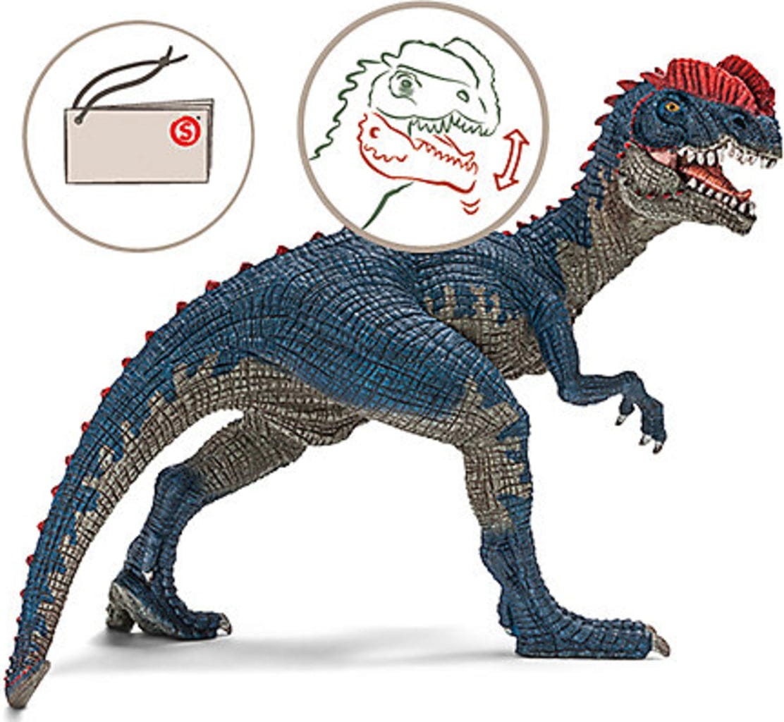 Junto con Compsognathus y Velociraptor, Dilophosaurus fue uno de los dinosaurios más rápidos del período Jurásico temprano. Aunque era uno de los lagartos prehistóricos más grandes, a pesar de su longitud corporal de 6 metros y un peso de 500 kg, podía alcanzar velocidades de hasta 38 km/h gracias a sus poderosas patas traseras. Llaman especialmente la atención las dos crestas óseas que tiene en la cabeza y que también le dan el nombre de “lagarto de dos crestas”.