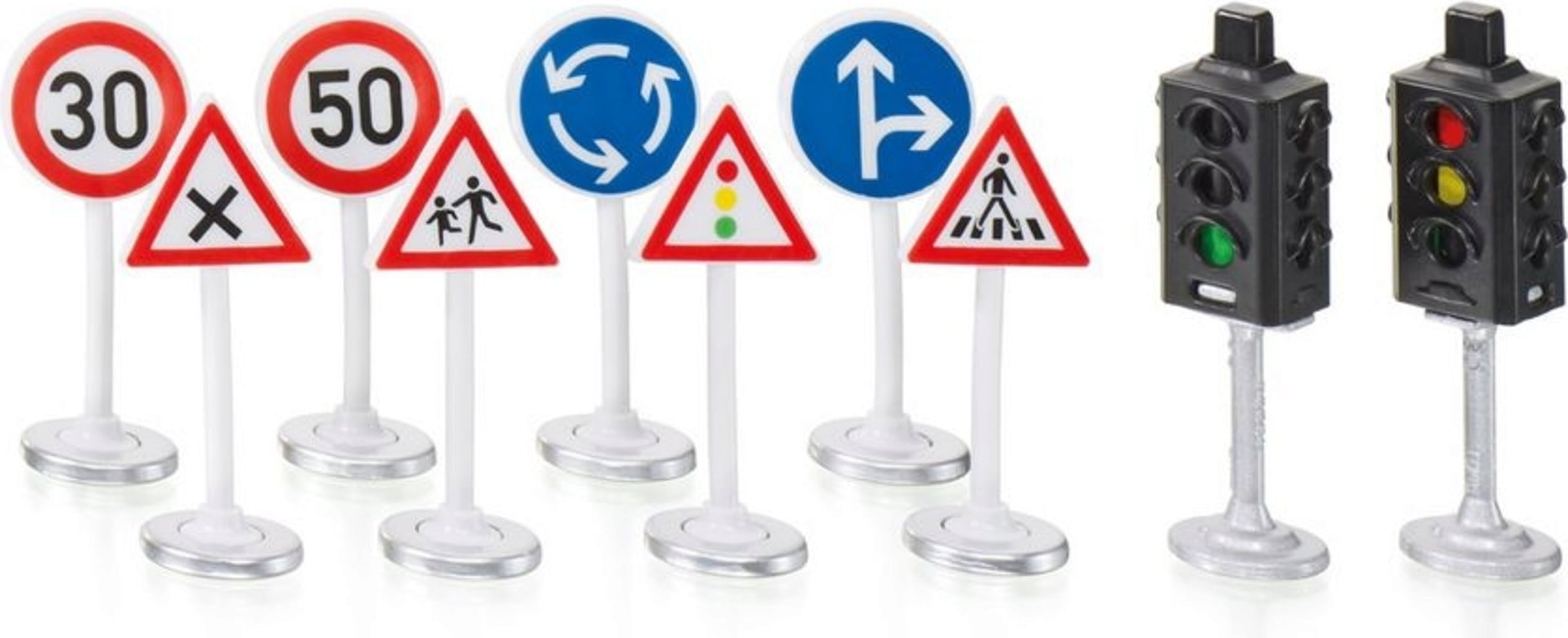 El semáforo pronto volverá a ponerse en verde y el viaje podrá continuar. Pero cuidado, pronto aparecerá una rotonda. Un fantástico conjunto de dos semáforos y ocho señales de tráfico que iluminarán el paisaje de tu ciudad.