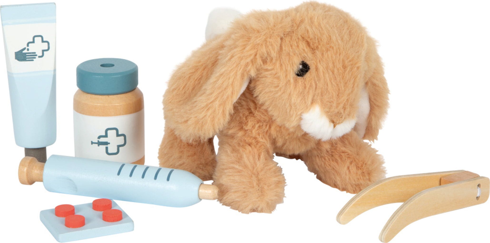 Con el maletín veterinario y el conejito de peluche, los pequeños veterinarios pueden empezar de inmediato, tanto en casa como fuera de ella. El maletín también sirve como bolso de viaje y maletín médico. Gracias a los numerosos accesorios, la tableta de rayos X y las tarjetas para escribir, es posible realizar imaginativas actividades de juego de rol relacionadas con la salud animal. Se fomenta la empatía, el sentido de la responsabilidad y la motricidad fina de forma lúdica: ¡un set listo para usar para los pequeños veterinarios en ciernes!