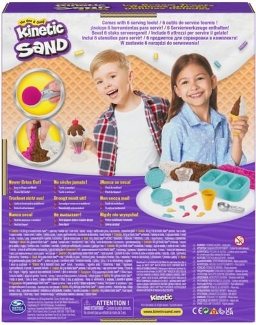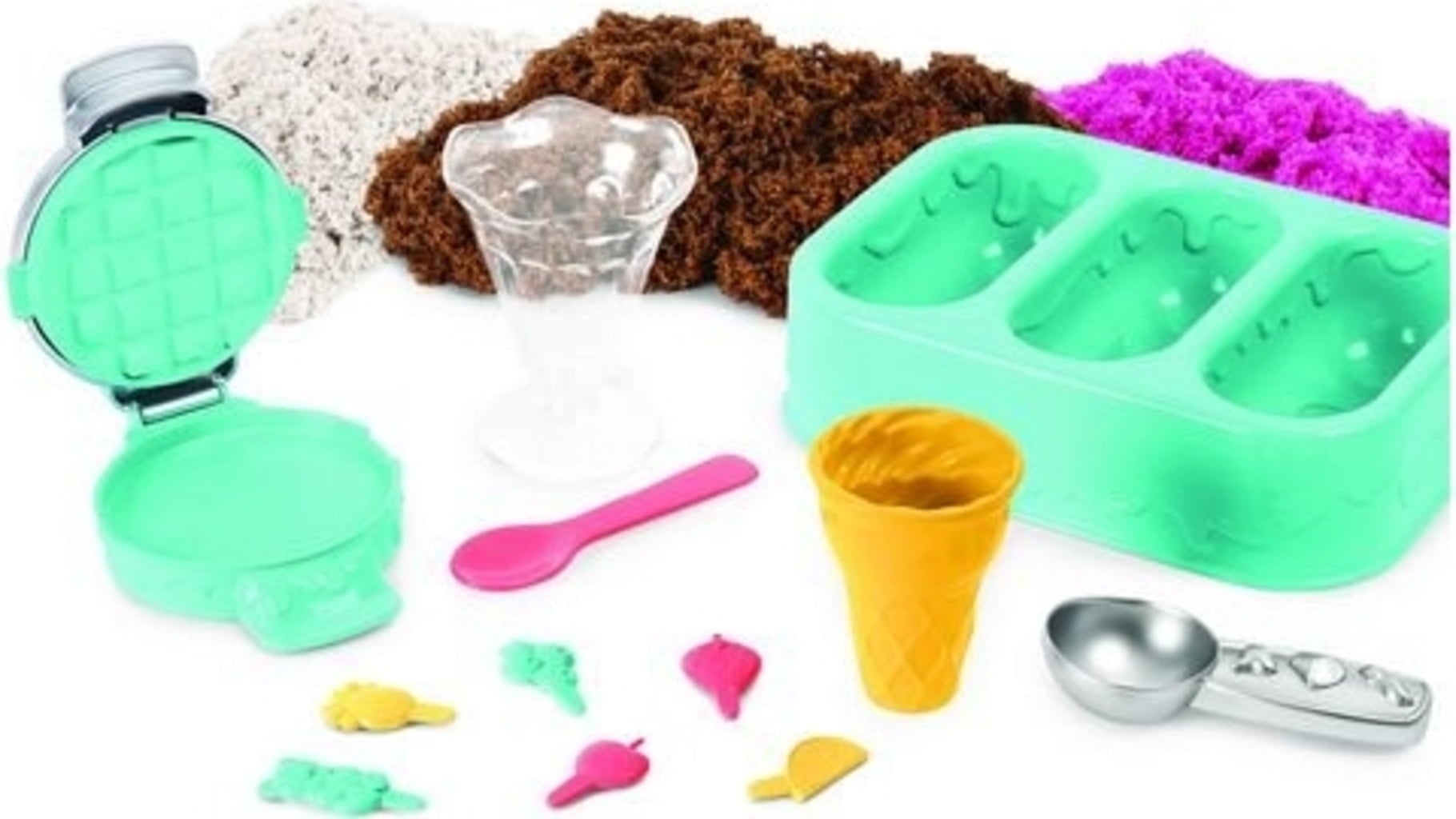 Contenido: 151 g de arena perfumada marrón, blanca y rosa, 1 recipiente de helado, 1 copa de helado, 1 cono de helado, 1 gofrera, 1 vaso medidor, 1 cuchara, 6 elementos decorativos.