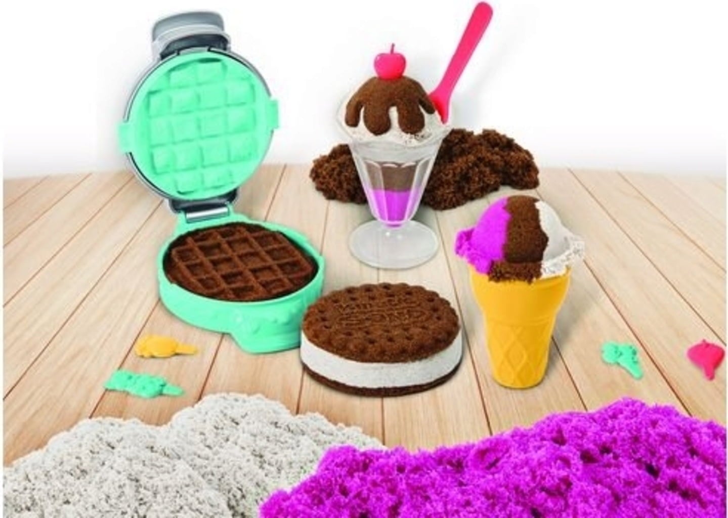 Mima a grandes y pequeños con deliciosos helados hechos de arena especial y perfumada. Gelatinas de colores con fantásticos toppings, cucuruchos de helado que parecen aparentemente reales... los amplios accesorios y la mezcla de diferentes colores permiten un increíble número de posibilidades.