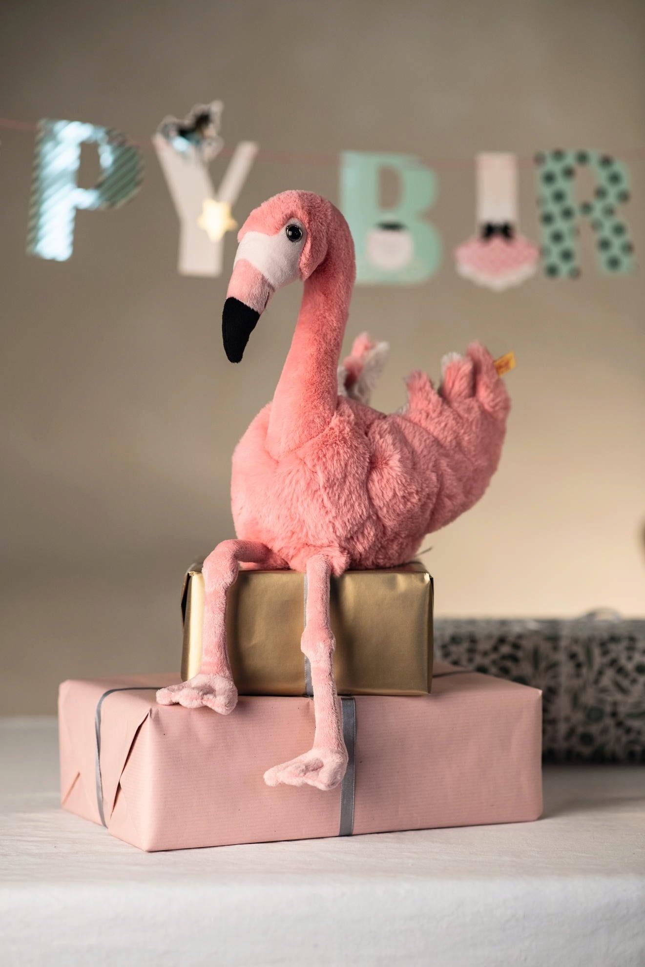 El flamenco Jill está completamente relajado y le gusta dejar que sus piernas cuelguen al fresco. La bolsa de granulado cosida estabiliza el cuerpo y evita que Jill se caiga. Si alguna vez se ensucia el esponjoso plumaje, Jill puede hacer su ronda en la lavadora y estará listo para recibir mimos de nuevo.