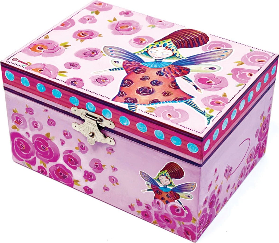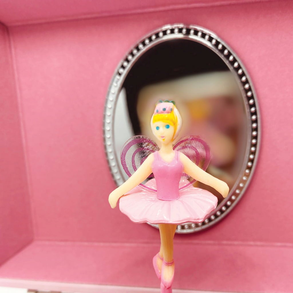 Una encantadora caja de música para recuerdos especiales, joyas y otros tesoros, decorada con un hada de las flores. Al abrir la tapa, la bailarina se pone a bailar delante del espejo.