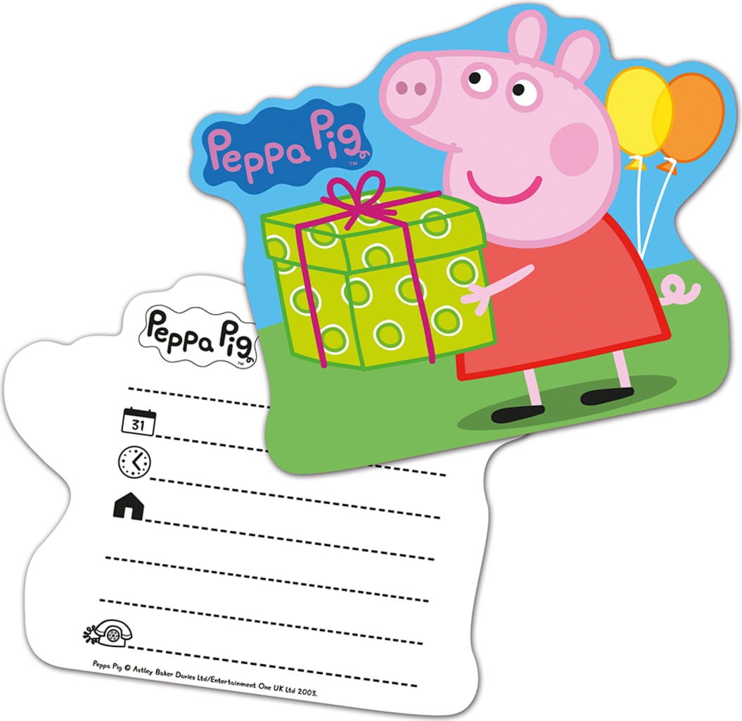 Con estas tarjetas de invitación con diseño de Peppa Pig, podrás invitar a tus mejores amigos y amigas a una fiesta de cumpleaños inolvidable. En el reverso encontrarás siete líneas preimpresas para incluir toda la información importante.
