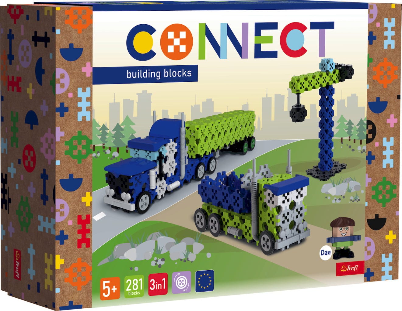 Construye y ensambla de forma diferente: Con los ladrillos Trefl CONNECT, puedes construir un semirremolque, un camión o una grúa con 281 piezas. Incluye una figura de Dan. Para niños a partir de 5 años.