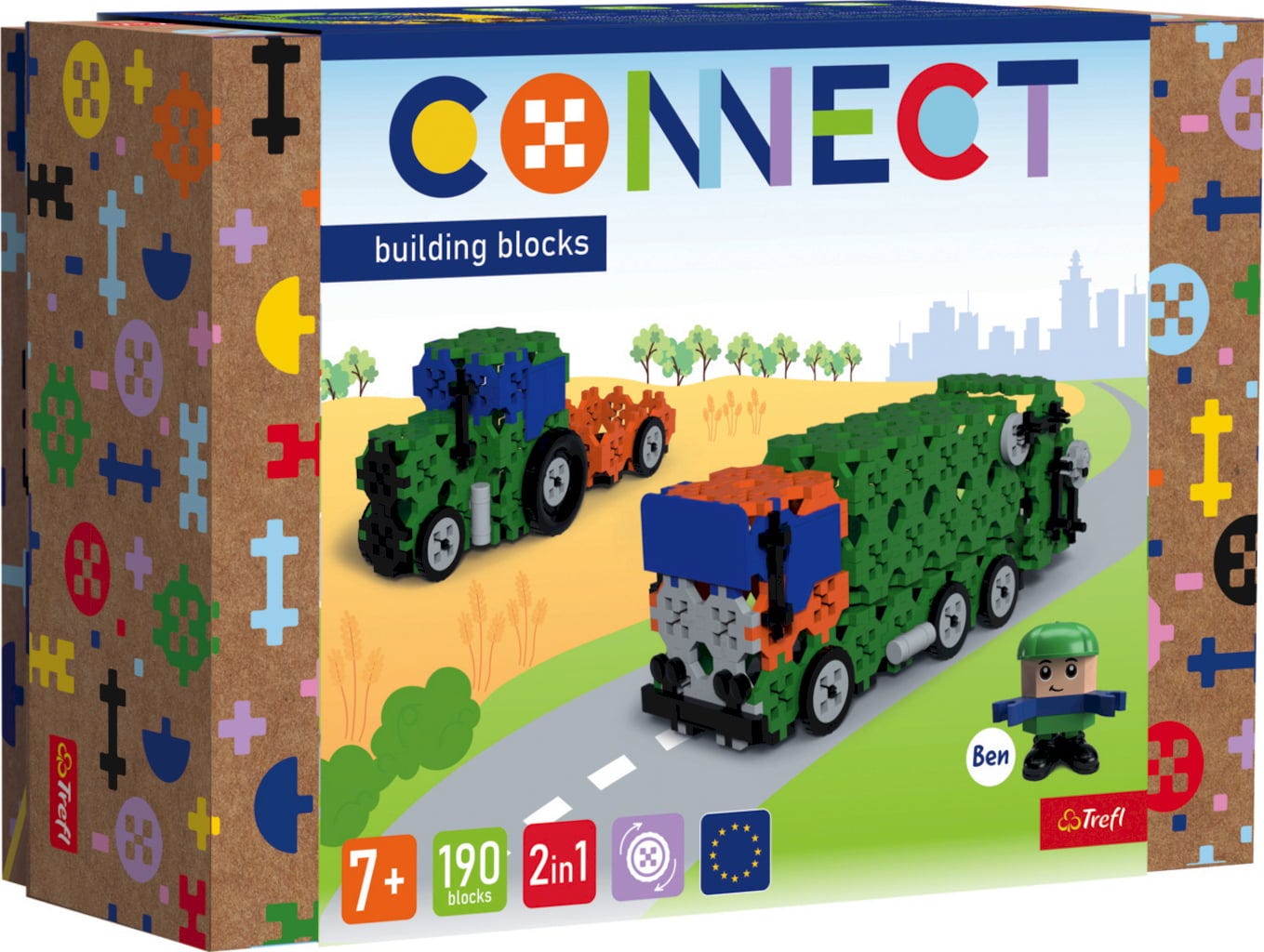 Construye y ensambla de forma diferente: Con los ladrillos Trefl CONNECT, puedes construir un camión de basura o un tractor con remolque con 190 piezas. Incluye una figura de Ben. Para niños a partir de 7 años.