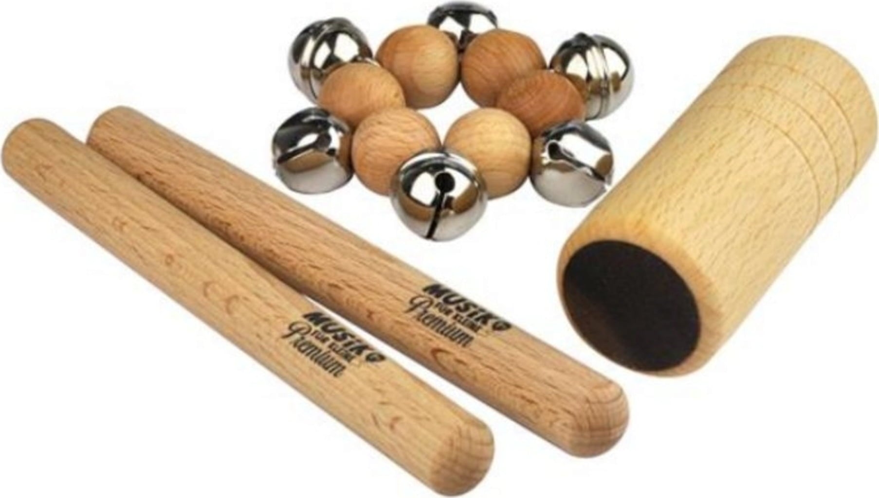 Contenido: 1 maxi shaker de madera clara, 1 brazalete de campana, 2 claves.